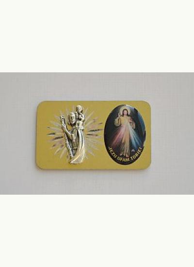Plakietka dla kierowcy z wizerunkiem świętego Krzysztofa i Jezusa Miłosiernego.