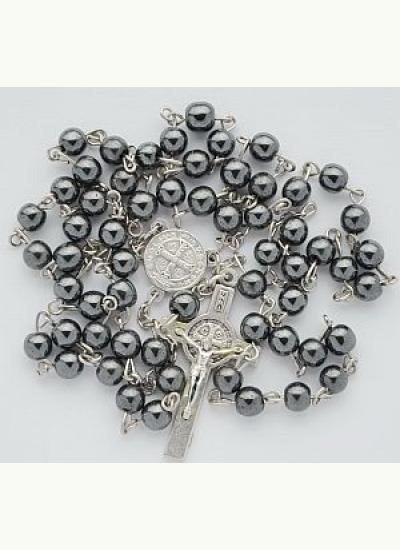 Wysokiej jakości produkt przygotowany trwale i solidnie. Paciorki różańca hematytowe grafitowe, łączone trwale metalowymi oczkami. Różaniec zakończony krzyżem Św. Benedykta.