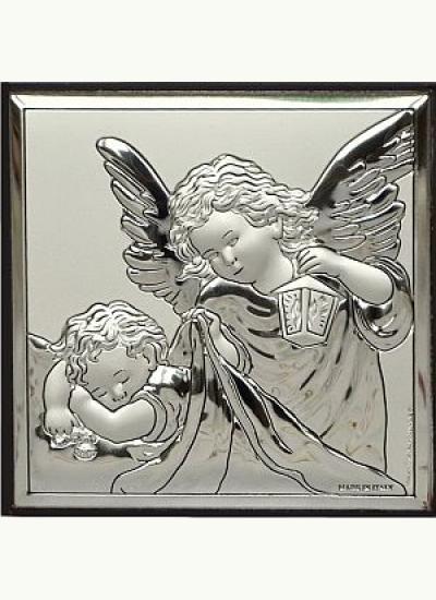 Obrazek laminowany srebrem z wizerunkiem Anioła Stróża. Prezent na Chrzest. Do obrazka dołączona jest podstawka, która pozwoli postawić go na półce. Obrazek zapakowany jest w estetyczne pudełeczko kartonowe.