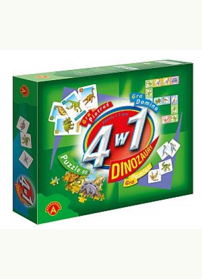 4 w 1 - Dinozaury to zestaw 3 różnych gier i 60 puzzli do układania.Wszystkie gry i puzzle łączy wspólny temat- dinozaury. Charakter gier jest zróżnicowany. Prosta gra w karty Piotruś wzbudzi największe zainteresowanie u najmłodszych. Gra Pamięć to dobry trening pamięci dla każdego. Domino jest również uniwersalne, grają w nie chętnie dorośli i dzieci.Puzzle, to świetne ćwiczenie spostrzegawczości, cierpliwości i skupienia.
