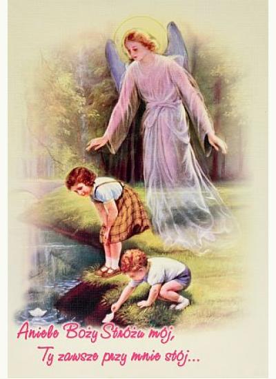 Obrazek na drewnie Anioł Stróż i dzieci, na odwrocie Modlitwa do Anioła Stróża